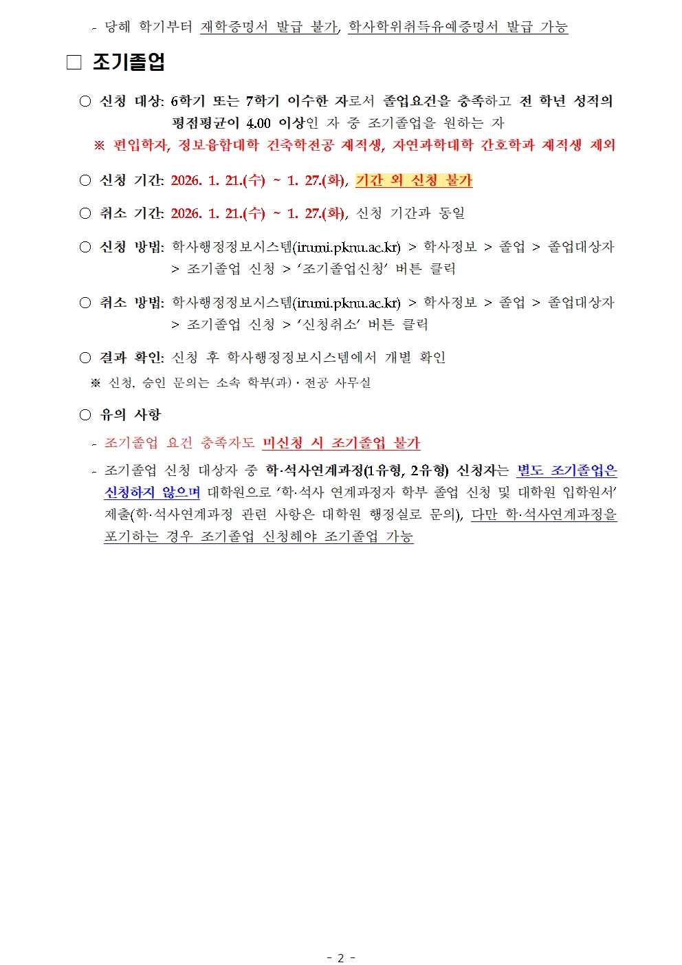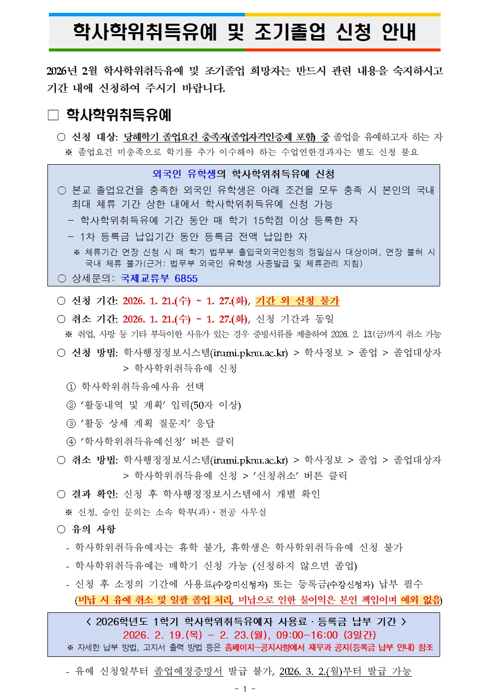 2026년 2월 학사학위취득유예 및 조기졸업 계획 알림(1/21~1/27)