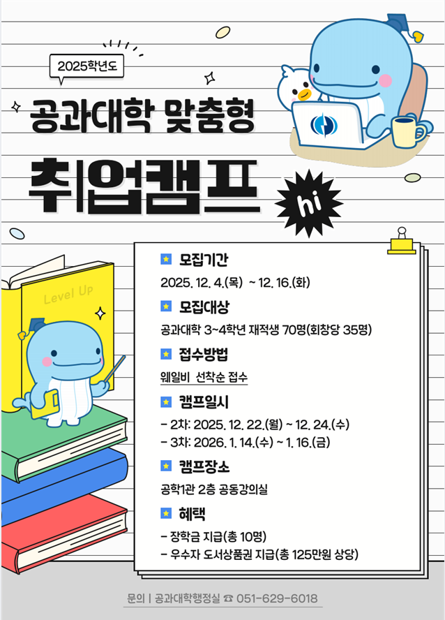 가. 프로그램 개요 2) 일 시 - 2차: 2025. 12. 22.(월) ~ 12. 24.(수) - 3차: 2026. 1. 14.(수) ~ 1. 16.(금) 3) 장 소: 공학1관 2층 공동강의실 4) 내 용 - 공학계열 산업(기업) 직무 이해 - 취업준비도에 따른 수준별 자소서 컨설팅 - 면접 교육 및 면접 체험 실시 나. 신청 개요 2) 모집대상: 공과대학 소속 3~4학년 재적생 70명(회차당 35명) 3) 모집 및 선발방법 - 국립부경대학교포털 로그인-부경 AI-비교과(웨일비)를 통해 접수 - 선착순에 의거하여 선발 4) 신청결과: 모집 종료 후 ‘웨일비-마이페이지’에서 확인 다. 지원 사항 2) 도서상품권 지급: 프로그램별 우수자 총 1,250,000원 지급 |
