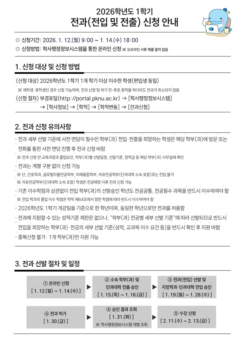 2026학년도 1학기 전과 실시 계획(26.1.12.~1.14. 18:00)