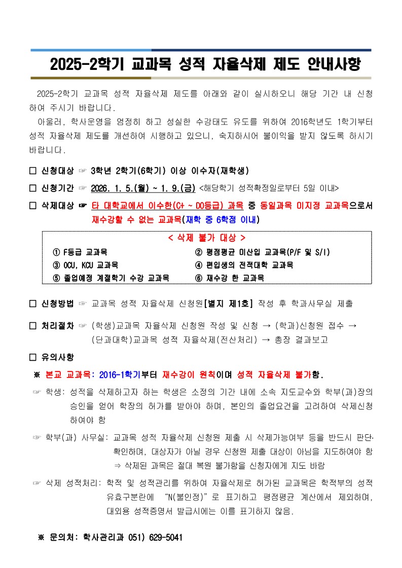 2025-2학기 교과목 성적 자율삭제 제도 안내(1/5~1/9)