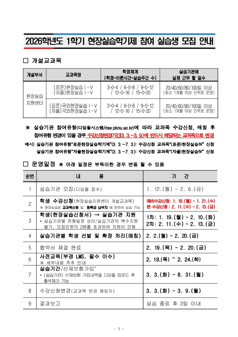 2026학년도 1학기 현장실습학기제 참여 실습생 모집 안내(1차: 1/19~2/10)